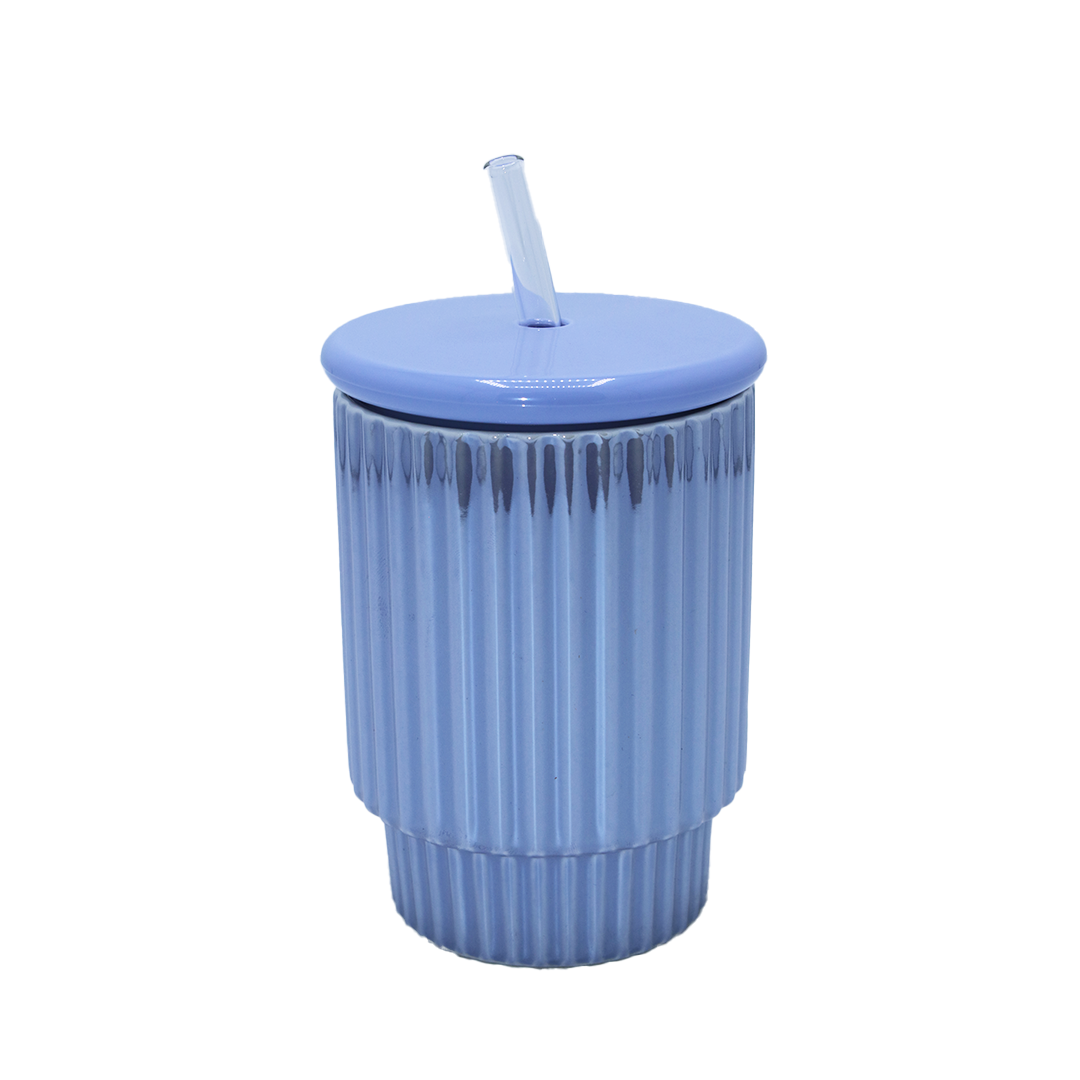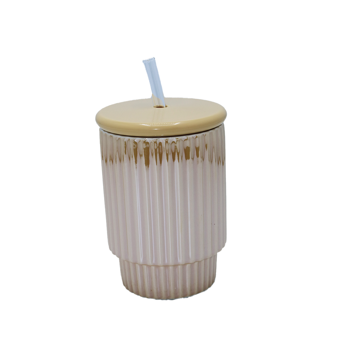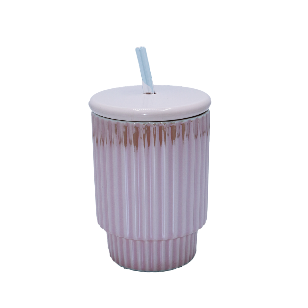 Cup With Lid & Straw 11X8Cm Ribbed Ceramic