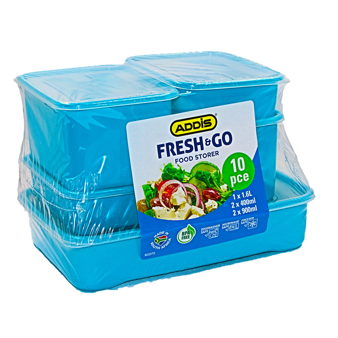 Efficiently store food with the Food Storer 10Pc Fresh & Go Addis. This set offers a variety of sizes for all your storage needs. Keep food fresher for longer with airtight seals and durable construction. Organize your fridge and pantry with ease while reducing food waste.