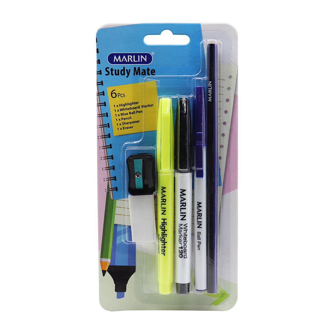 The Marlin Study Mate Kit 6Pc is a comprehensive set of study essentials. It includes various stationery items such as pens, pencils, highlighters, and more, providing everything you need for effective studying and note-taking. This kit is perfect for students of all levels.